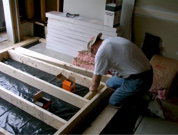 Vysoký monolitický pódium je vyroben ze dřeva naplněného betonem a povrch elevace je předem vyrovnán kravatou. Povlak se nanáší buď stejně jako v místnosti jako celku, nebo může vypadat odlišně: liší se barvou, kvalitou materiálu, aby nějakým způsobem přidělil prostor pro spaní v okolním. Na samotném pódiu, které navazuje na kuchyňské zákoutí, je pak jídelní stůl. Zvýšené úložné podium Konstrukce je kvůli požadované vysoké únosnosti svařena z kovových profilů x mm. Na její výrobu však můžeme použít i silnější dřevěné hranolky.